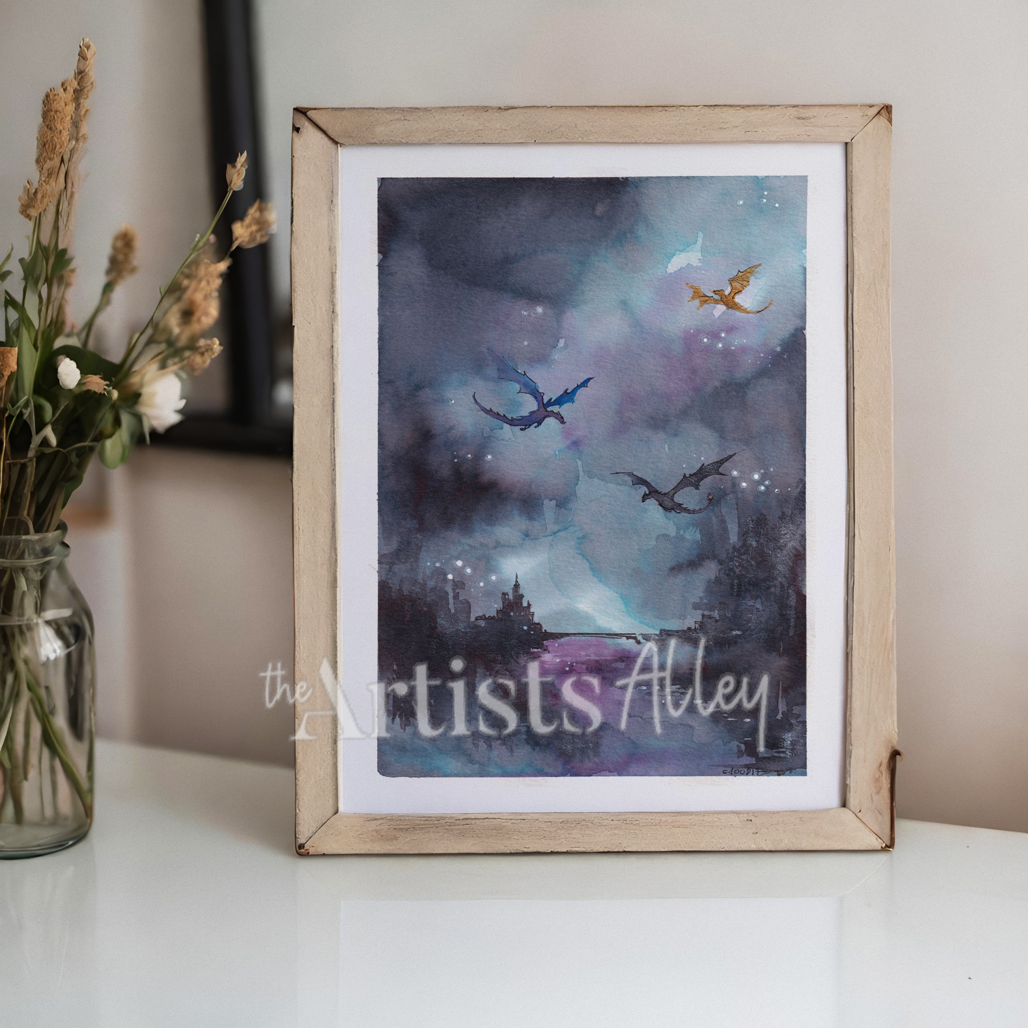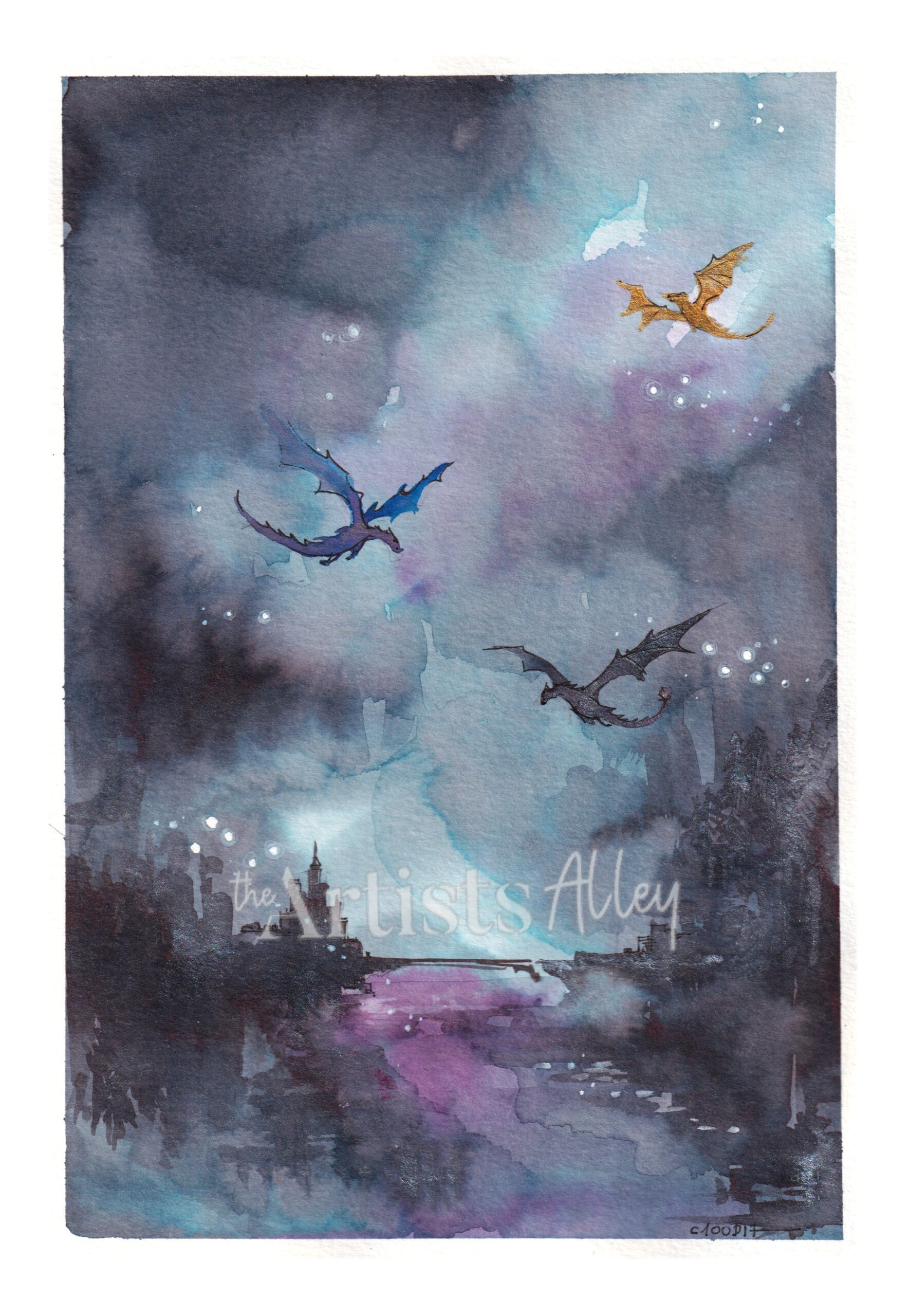 Cette aquarelle originale capture un instant suspendu : trois dragons majestueux — un grand noir aux ailes déployées, un bleu agile et un petit éclat doré — survolant un paysage nocturne aux teintes boréales. En contrebas, les lumières d'une cité fortifiée et son pont de pierre s'éveillent dans la brume.