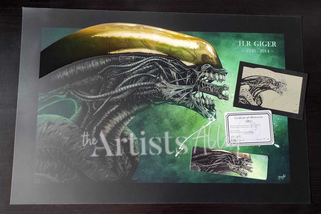 Le vernis sélectif est appliqué sur la "visière" de l'Alien, la salive, et les caractères consacrés à GIGER.
