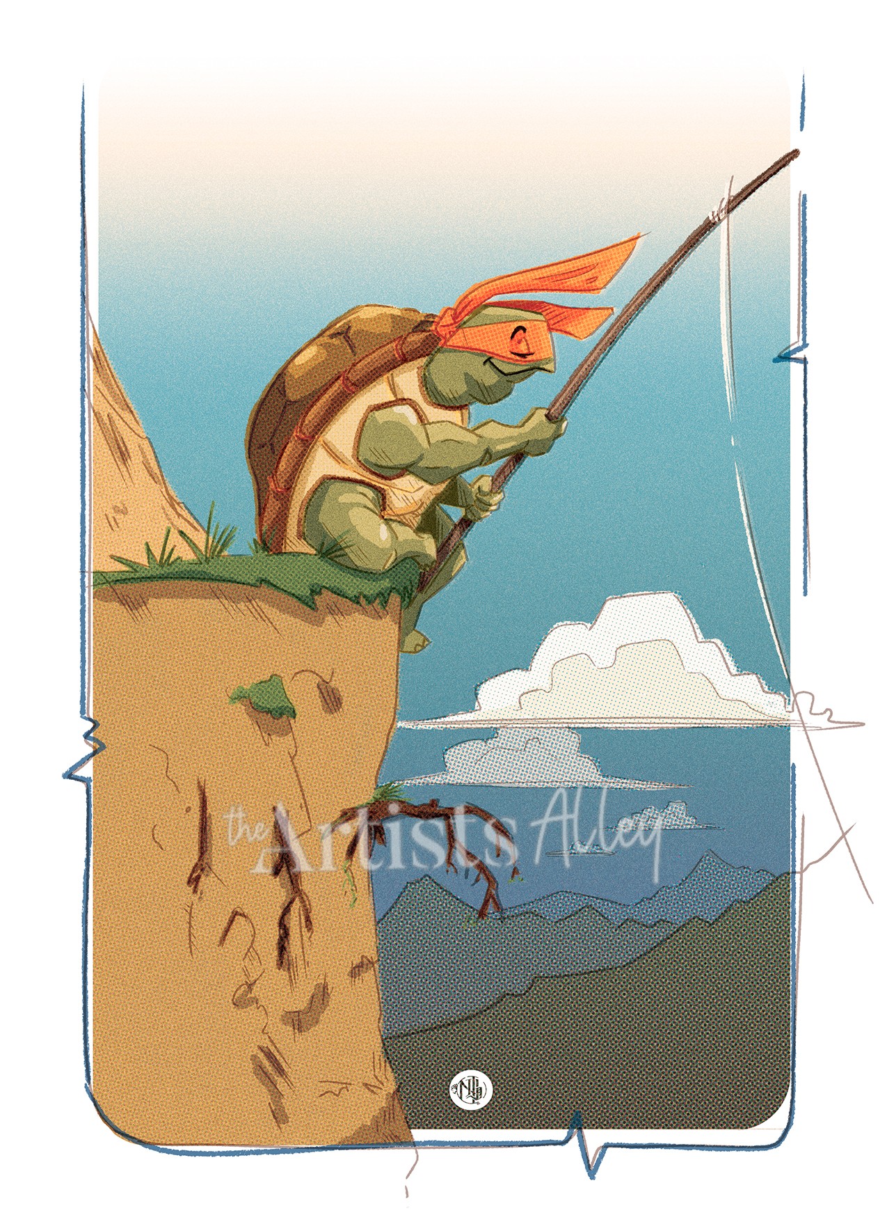 PRINT : Une tortue (ninja) qui pêche à flanc de montagne.