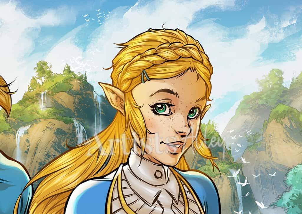 Interprétation personnelle de Link et Zelda, inspirée du jeu vidéo Zelda : Breath of the Wild.